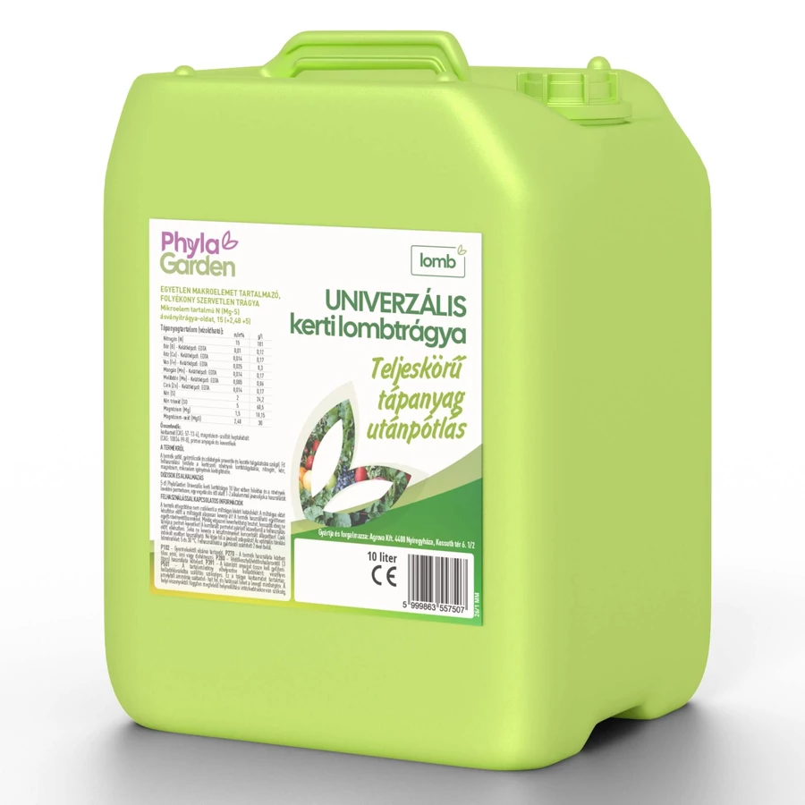 A PhylaGarden Univerzális kerti lombtrágya egy magas nitrogéntartalmú, mikroelemekkel, kénnel és magnéziummal kiegészített lombtrágya, amely gyors segítséget nyújt a növényeknek a tenyészidőszak során. Lombon keresztül hatékonyan felszívódik, kíméletes, perzselésmentes formulával. -