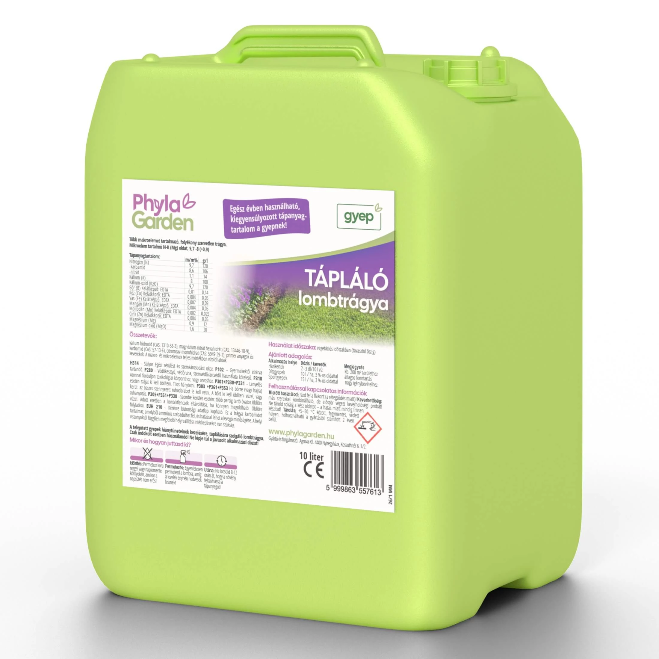 A PhylaGarden Gyep tápláló lombtrágya egy kiegyensúlyozott összetételű, N–K túlsúlyos lombtrágya, amely segíti a gyep egészséges növekedését, dúsulását és általános kondícióját. Lombon keresztül gyorsan felszívódik, így hatékony megoldást ad a mindennapi gyepápolásban – tavasztól őszig.